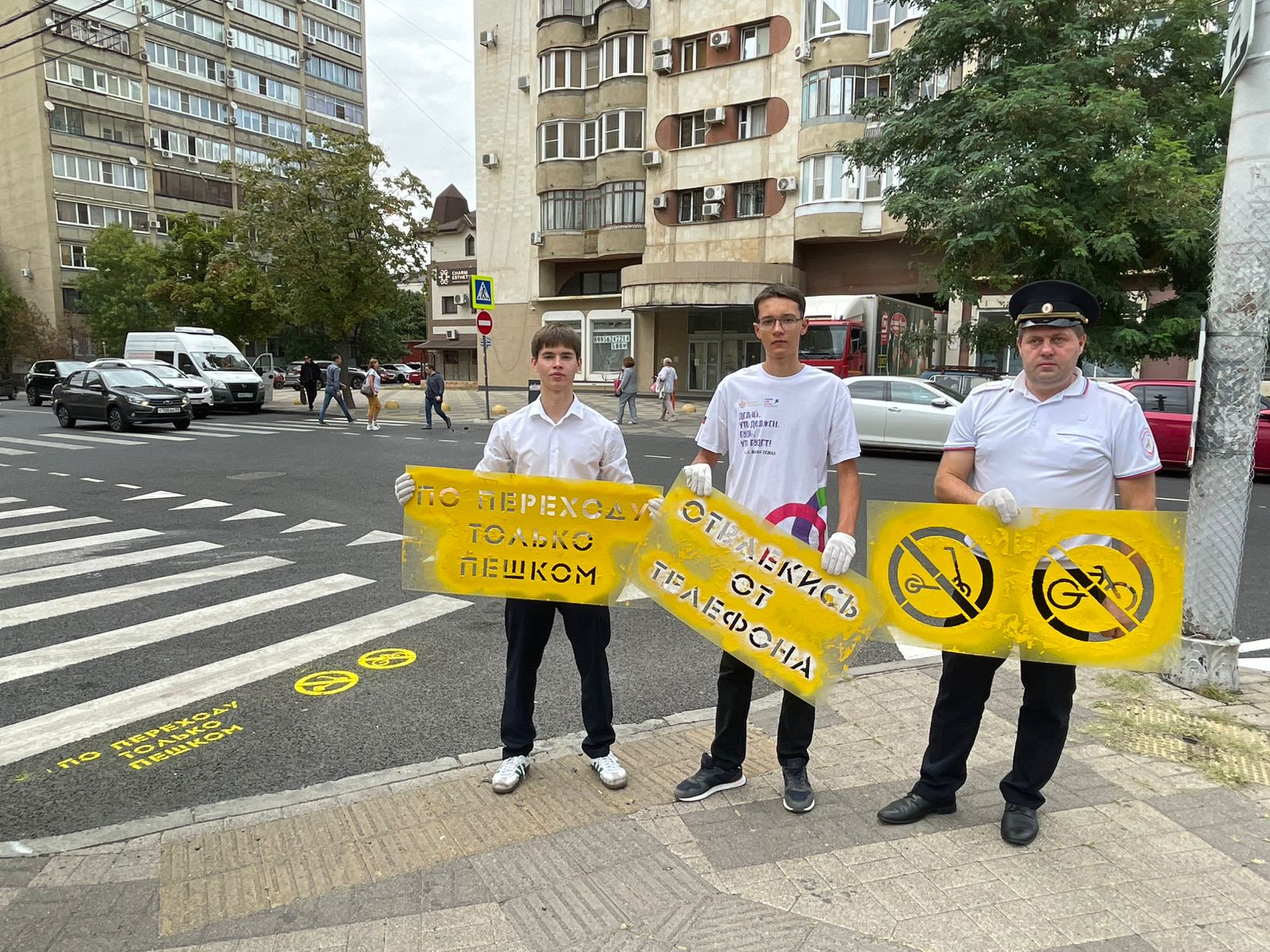 Надписи «Возьми ребёнка за руку», «Отвлекись от телефона», «По переходу только пешком», дорожные знаки «Движение на велосипеде запрещено» и «Движение на средствах индивидуальной мобильности запрещено» помогают привлечь внимание взрослых и детей к ключевым правилам безопасного перехода проезжей части, снизить количество ДТП с участием несовершеннолетних, напомнить о простых, но жизненно важных действиях, которые могут предотвратить трагедию.